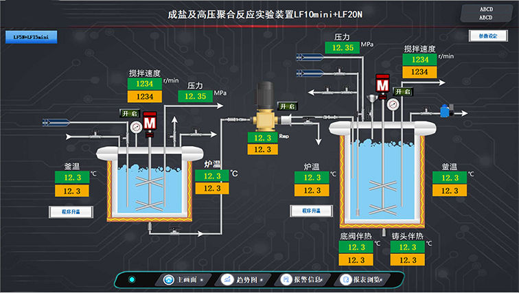 觸摸屏界面可設定實驗所需的溫度、攪拌速度,檢測顯示實際溫度、壓力、轉速,控制攪拌器、平流泵、冷水機的開啟、關閉等。